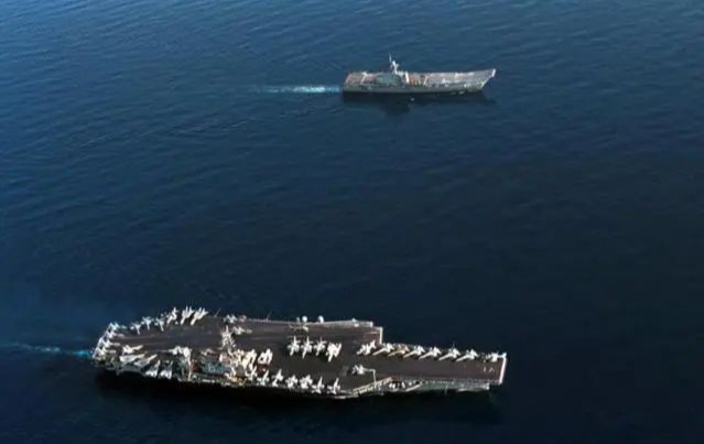 และเรือที่ขับขนานกันด้านล่างของภาพ คือเรือบรรทุกเครื่องบินชั้น Ford ของอเมริกา