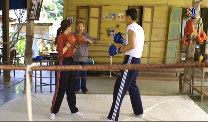จันทร์กระพ้อสอนมวยอัทธ์ ใช้เท้าเขี่ยขาของเขาให้ย่างสามขุมให้ถูกต้อง “ถนัดขวาต้องใช้ขาซ้ายเป็นหลัก” แล้วเธอก็ใช้เท้าเตะขาอัทธ์ให้เข้าที่ “ขาตรงเป็นไม่บรรทัดอย่างนี้เดี๋ยวก็โดนเขาเตะร่วงหรอก เอาใหม่ ตั้งการ์ดใหม่ ย่อขาถ่วงน้ำหนักให้ดี” จันทร์กระพ้อให้มือตบไปที่หมัดของเขา อัทธ์ไม่ทันตั้งการ์ด หมัดจึงกระแทกโดนหน้า “ให้มันแข็งแรงหน่อยสิ เขาเอาไว้กันคู่ต่อสู้ นี่อ่อนเป็นนางรำเชียว” ปุ้มปุ้ยมองคิดๆ แล้วเดินเข้ามา “มา...พ่อฝึกต่อให้เอง ไอ้จันท์เองไปเตรียมกับข้าวกับปลาได้แล้วปะ เดี๋ยวชวนคุณอัทธ์เค้ากินข้าวเที่ยงด้วย” จันทร์กระพ้อเดินก้าวไปข้างหลังอัทธ์ 1 ก้าว แล้วใช้แม่ไม้โดยใช้เท้าเกี่ยวไปด้านหลังน่องของเขาใช้ศอกผลักเขาล้มก้นจ้ำเบ้า “จะหัดมวยหูตามันต้องไวซิ” จันทร์กระพ้อเดินออกไป ปุ้มปุ้ยยื่นมือให้อัทธ์ “ลุก...ลุก...ไอ้ทิด เอาใหม่...เอาใหม่” อัทธ์ยิ้มเจื่อนๆ