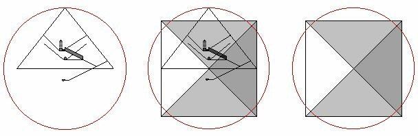 หากเราวาดวงกลมที่มีรัศมีเท่ากับความสูงของพีระมิด จะได้วงกลมที่ใหญ่เกินฐานแต่ละฐานออกไปเล็กน้อยและตัดมุมพีระมิดเข้ามาเล็กน้อย พูดง่ายๆว่าวงกลมจะมีพื้นที่เกือบเท่าสี่เหลี่ยมที่เป็นฐานพีระมิด