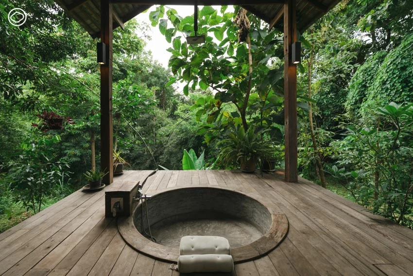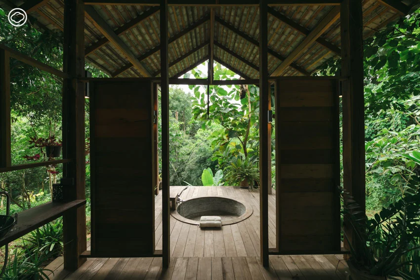 ส่วนห้องน้ำต้องเดินออกไปนอกกรงแมว จะเจอทั้งห้องน้ำและอ่างอาบน้ำกึ่งกลางแจ้งวิวธรรมชาติที่ชวนให้แช่น้ำจนไม่อยากลุก