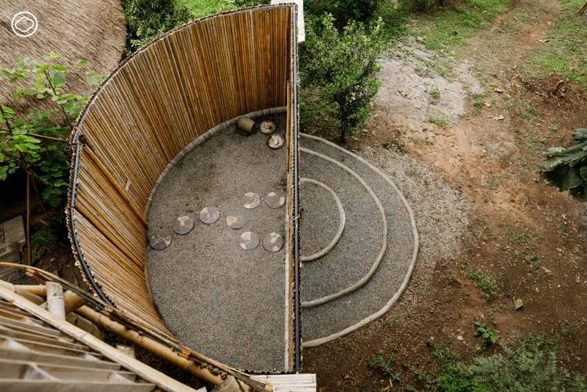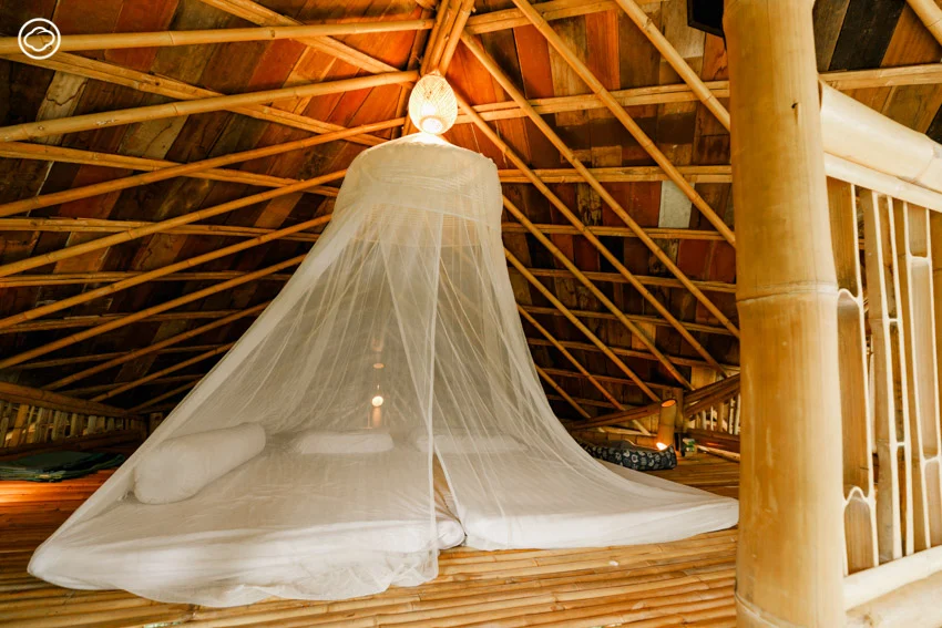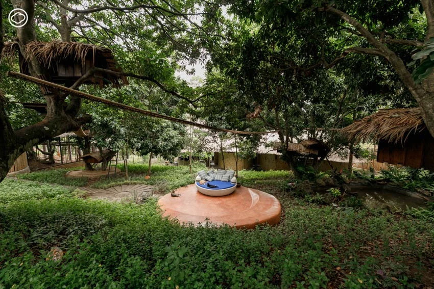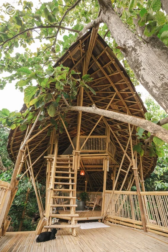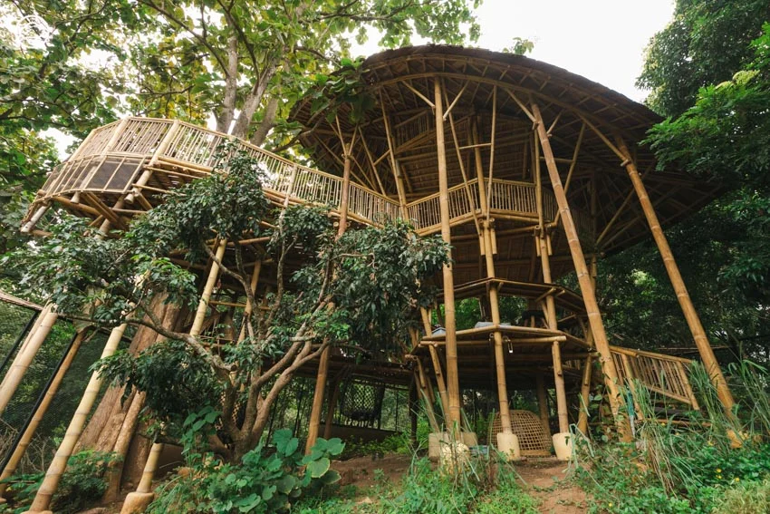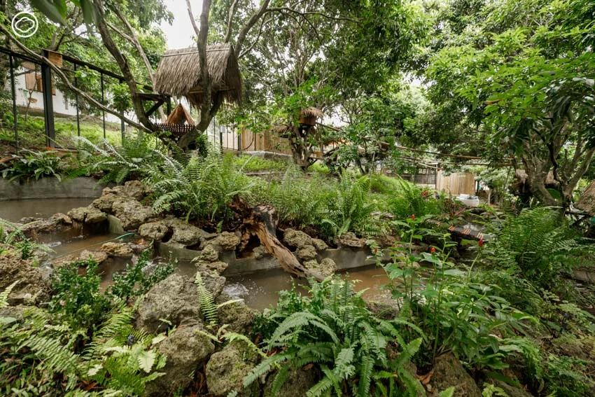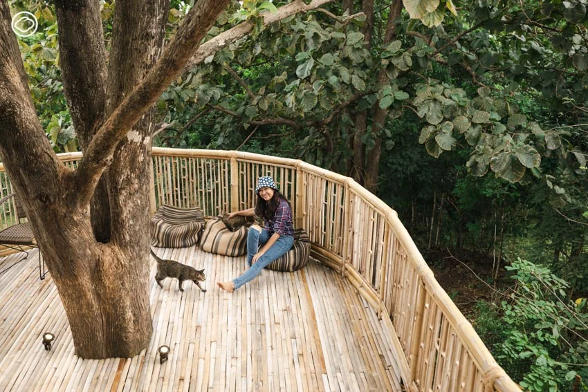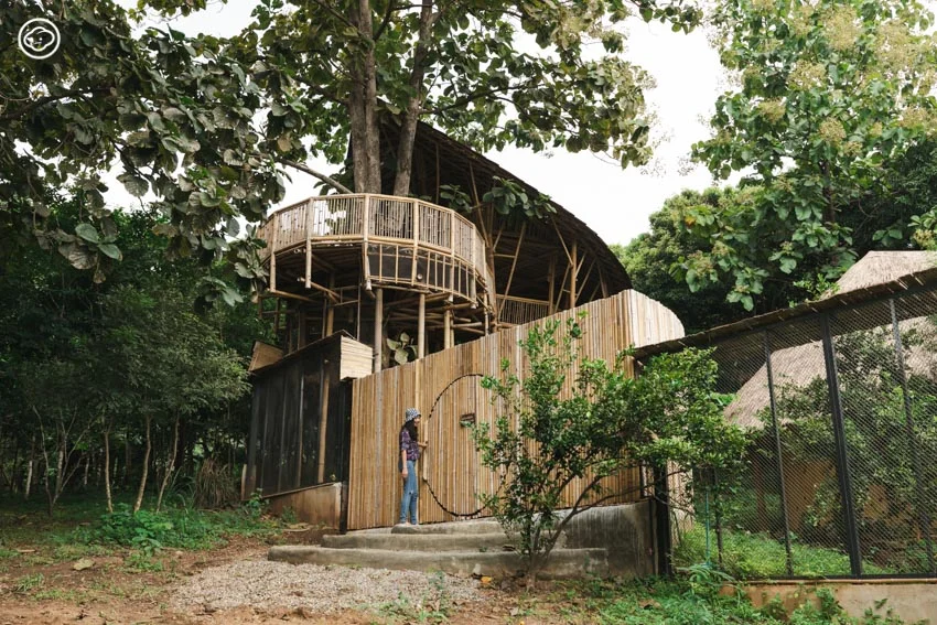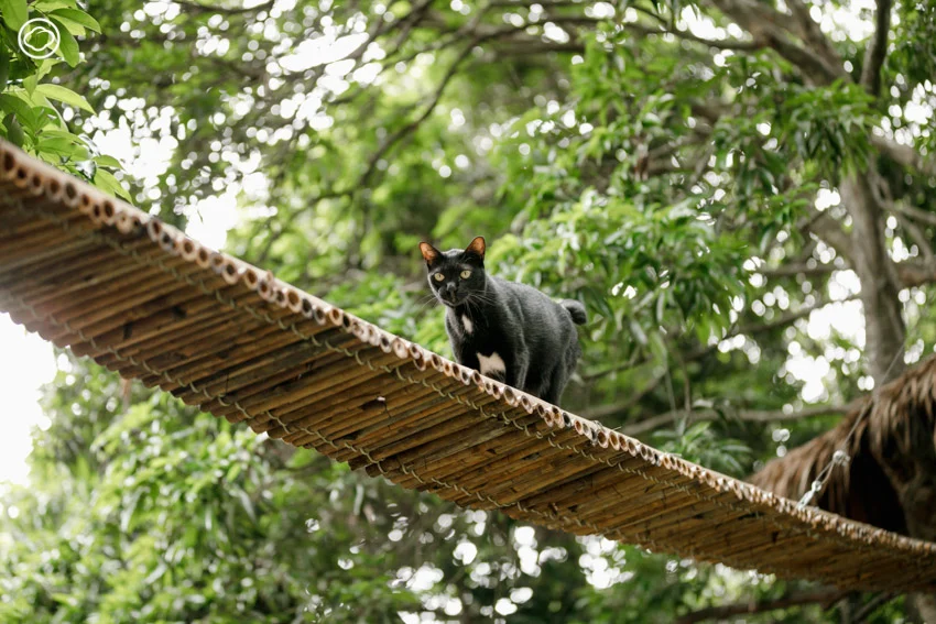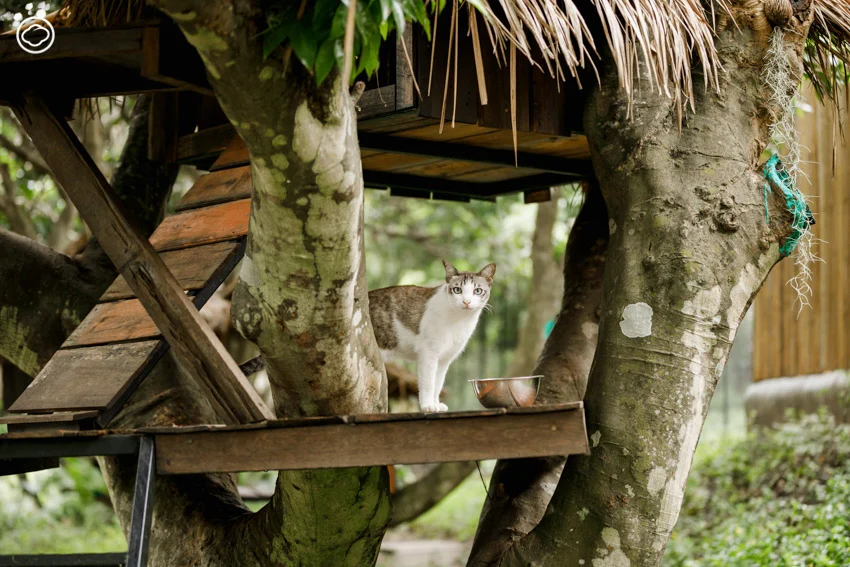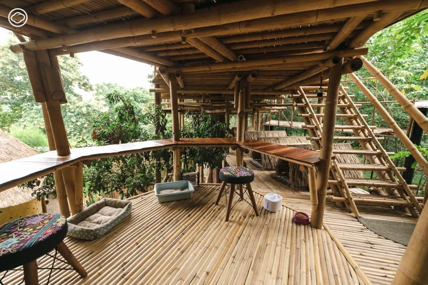 มุมหนึ่งในกรงแมวเป็นบ้านไม้ไผ่สองชั้นที่สร้างแบบโปร่งโล่งแต่เส้นสายสวยดีเหลือเกิน บ้านหลังนี้อยู่ติดกับต้นสัก ซึ่งมีนกฮูกแวะเวียนมาทำรัง พอขึ้นมาบนบ้าน เลยให้ความรู้สึกเหมือนอยู่บนบ้านต้นไม้