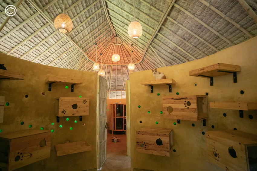 “ถ้ามองลงมาจะเห็นภาพรวมของบ้านแมวเป็นรูปแมวนอนขด ครัวเป็นหู บ้านดินเป็นหาง” พี่จูดี้ชี้ให้ดูบ้านดินขนาดย่อม 3 หลัง หลังแรกสุดเป็นห้องพยาบาลให้น้ำเกลือแมวป่วย อีก 2 หลังเป็นที่อยู่ของแมว มีชั้น มีที่นอนให้นอน สบายเหมือนรีสอร์ต นอนได้หลังละ 20 ตัว