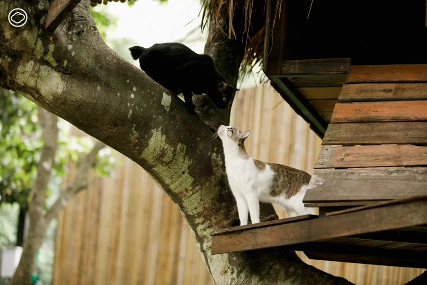 “ช่วงที่บ้านพี่ยังสร้างอยู่ เราก็อยากอยู่ในนี้ เลยสร้างบ้านขึ้นมาอีกหลัง จะได้อยู่ใกล้ ๆ แมว” พี่จูดี้พูดถึงบ้านไม้ที่เรากำลังนั่งคุยกันอยู่ ชั้นล่างสุดเป็นบ้านแมว เต็นท์แมว และโต๊ะยาวให้นั่งเล่นได้ ยกพื้นขึ้นมาเป็นลานไม้ท่ามกลางธรรมชาติ นั่งดูวิวเล่นกับแมวได้สบาย ปีนขึ้นไปอีกชั้นเป็นห้องนอน