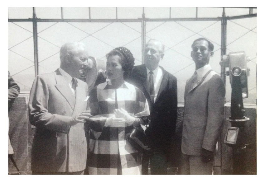บนจุดยอดสุดของตึกเอ็มไพร์สเตท สมเด็จพระนางเจ้าฯ พระบรมราชินีนาถ กำลังทรงสนทนากับ จอมพลดไวต์ เดวิด ไอก์ ไอเซนฮาวร์ ส่วนพระบาทสมเด็จพระเจ้าอยู่หัวทอดพระเนตรทิวทัศน์อันตระการตาของแมนฮัตตัน