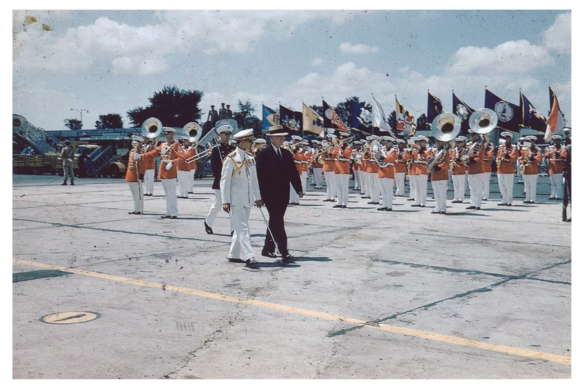 สนามบินแมทส์ (MATS : Military Air Transport Service Terminal) คือสถานที่แห่งแรกที่ในหลวงเสด็จฯ ภาพนี้ถ่ายทอดเรื่องราวที่ดูเป็นทางการด้วยพิธีต้อนรับจาก จอมพลดไวต์ เดวิด ไอก์ ไอเซนฮาวร์ (Dwight David “Ike” Eisenhower) ประธานาธิบดีคนที่ 34 ของสหรัฐอเมริกา และแถวทหารกองเกียรติยศสง่างาม ทว่าเบื้องหลังของภาพนี้ วิจิตรเล่าให้ฟังด้วยยิ้มร่าว่า เขาเป็นช่างภาพเพียงคนเดียวที่ได้รับอนุญาตให้วิ่งไปมาเพื่อจับภาพเหตุการณ์นี้อย่างใกล้ชิด พิเศษกว่านักข่าวรายอื่นๆ ที่จำต้องยืนอยู่บนสแตนด์ไม้เบื้องหลัง คอยบันทึกภาพจากเลนส์เทเลโฟโต้