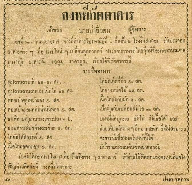ตัวอย่างโฆษณา ร้านกงหยี่ภัตตาคาร ชื่อเจ้าของร้านออกสำเนียงจีนไหหลำ (?) ..เทียบราคาอาหารแต่ละเมนูแล้วต้องแอบยิ้ม เพราะใช้หน่วยสตางค์ มิใช่ บาท .. สมัยนั้นไหหลำยังขึ้นอยู่กับมณฑลกวางตุ้ง เพิ่งแยกเป็นมณฑลไหหลำเมื่อไม่นานนี้ โฆษณาชิ้นนี้ จึงมีเสน่ห์หลายแห่ง ให้เราศึกษา เช่น ร้านงิ้ว ฮกลอก ก็ไม่ทราบยังอยู่ไหม และ “อาหารดี รสสูง ราคาถูก” ของร้านนี้ โฆษณาชิ้นนี้นำมาลงไว้เพื่อให้เห็นบรรยากาศเท่านั้น มิได้เกี่ยวข้องโดยตรงกับชีวิตของเด