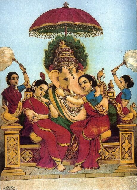 พระคเณศกับเหล่าเทวี, ผลงาน Raja Ravi Varma (ภาพจาก Wikimedia Commons)