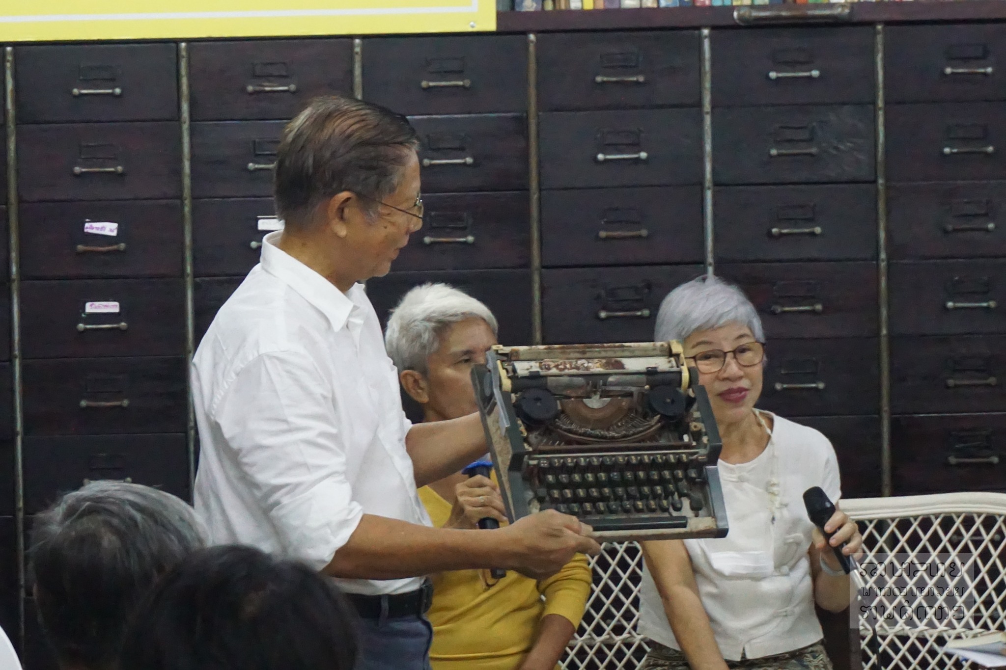 อ.เอนก นาวิกมูล ยกพิมพ์ดีดของคุณทิพย์วาณี แสดงให้ผู้ชมในวงเสวนาได้รับชม